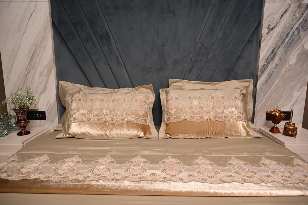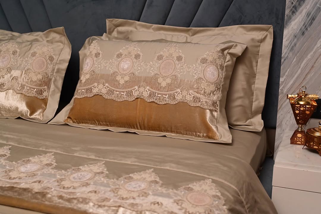 A luxurious bedding set featuring intricate gold embroidered lace detailing complemented by elegant gold velvet borders on the pillow covers and comforter cover, creating a rich and graceful bedroom statement.
