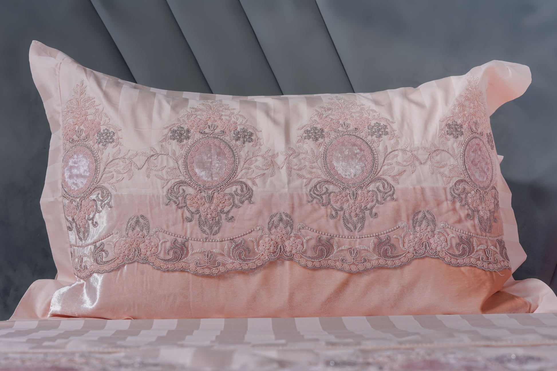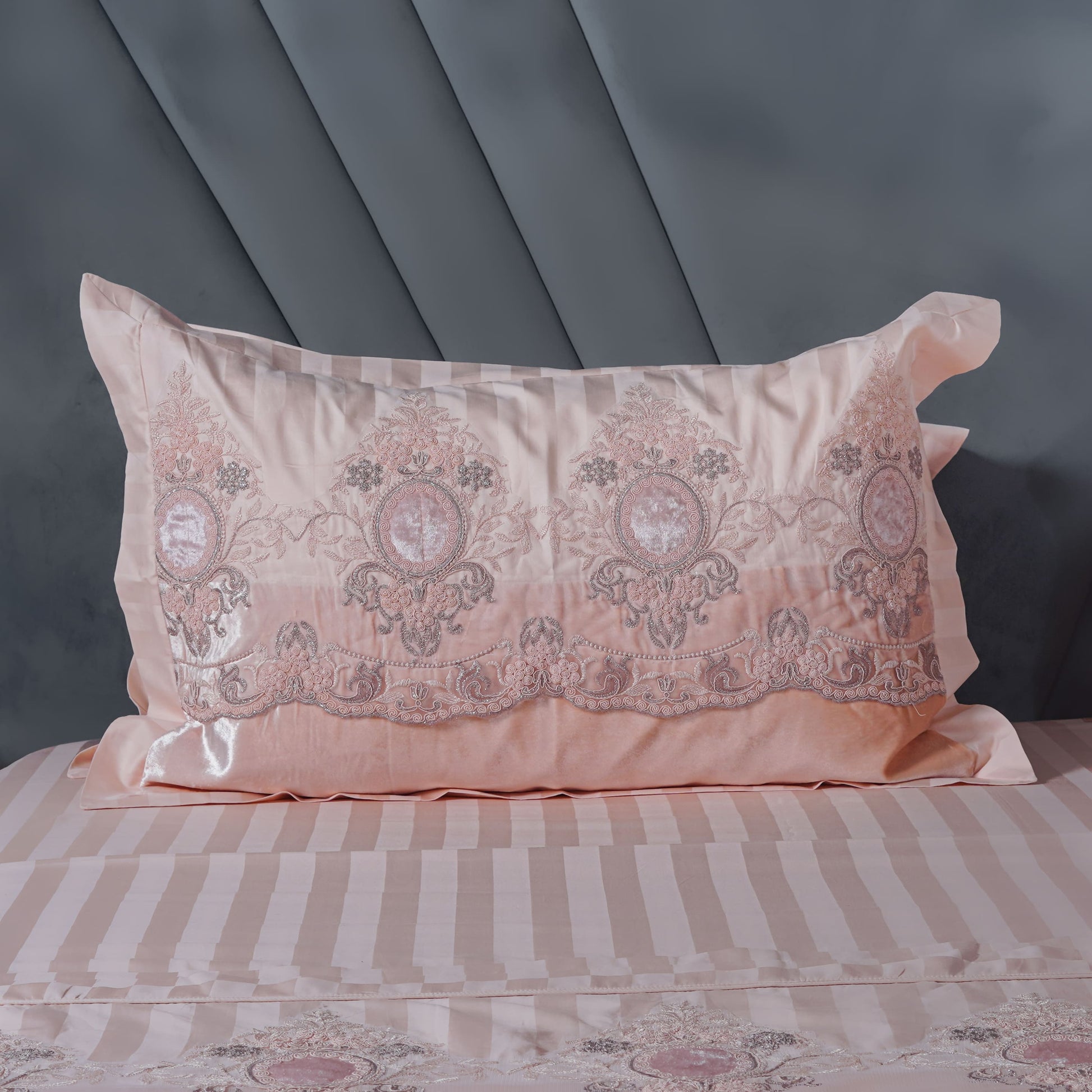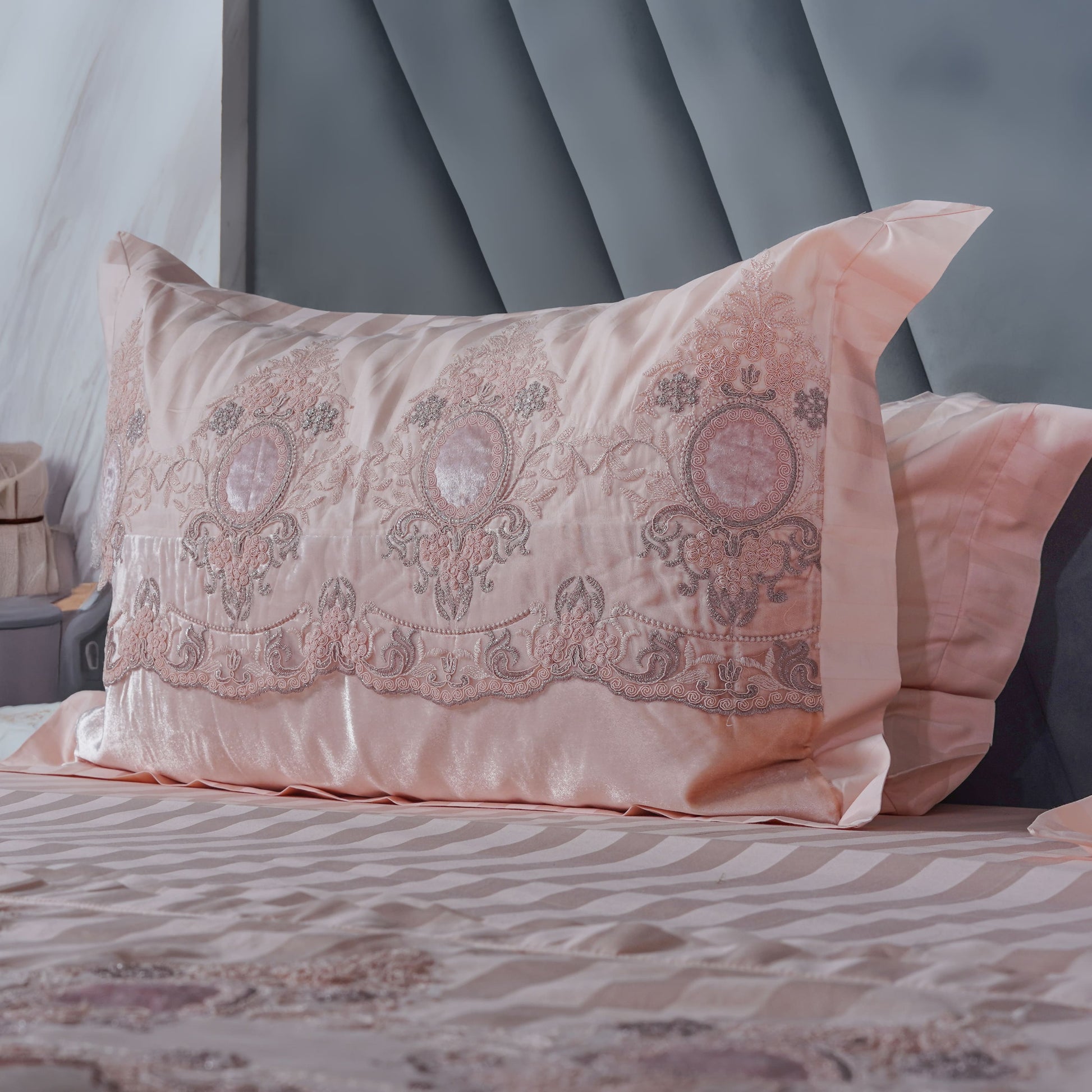 A luxurious bedding set featuring intricate peach embroidered lace detailing complemented by elegant peach velvet borders on the pillow covers and comforter cover, creating a rich and graceful bedroom statement.