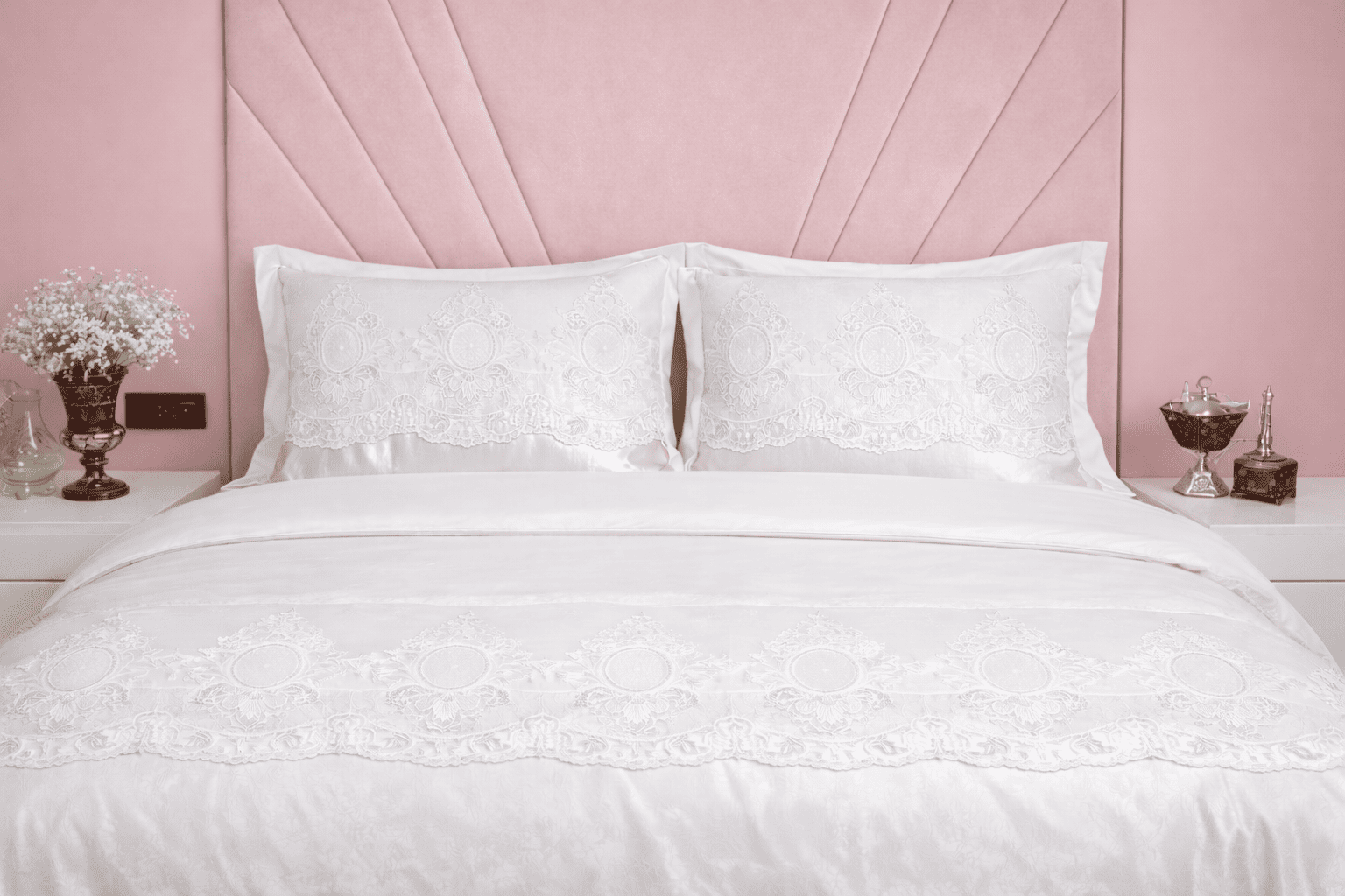A luxurious bedding set featuring intricate white embroidered lace detailing complemented by elegant white velvet borders on the pillow covers and comforter cover, creating a rich and graceful bedroom statement.