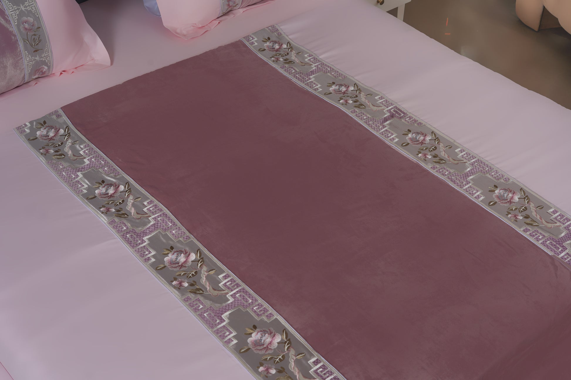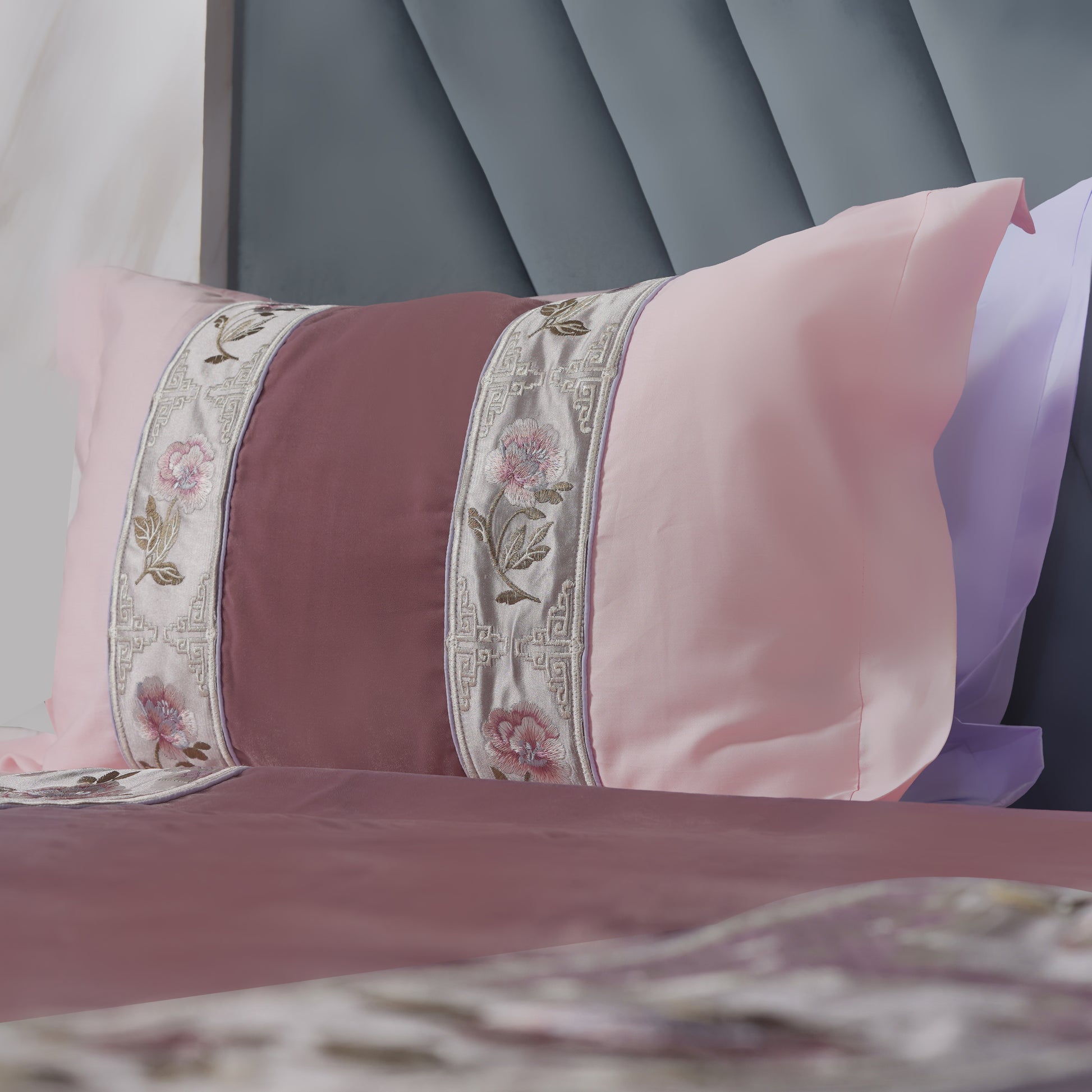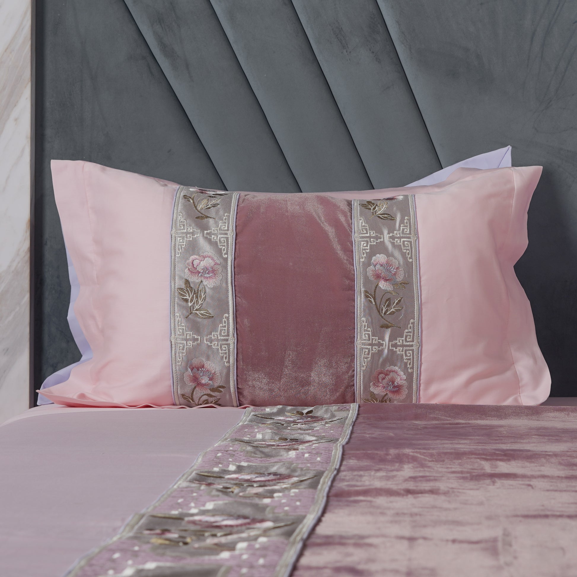 Elegant bedding set featuring velvet centre panels with vertical embroidery for a rich and sophisticated look.