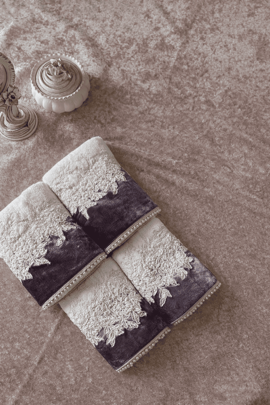 Elegant hand embellishment adds a sophisticated accent to everyday essentials